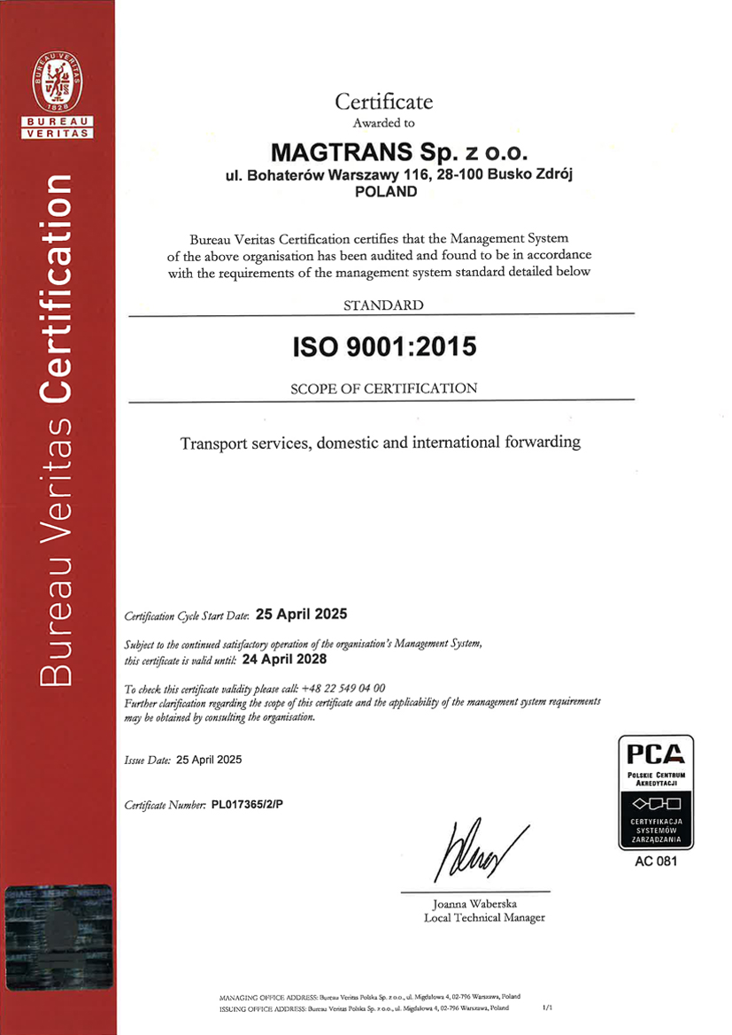 The independent, accredited certification body Baureau Veritas recognized the management system of Magtrans Sp. z o.o. as compliant with the requirements of ISO 9001:20015. The certificate confirms that our company provides only the highest quality of services for you.